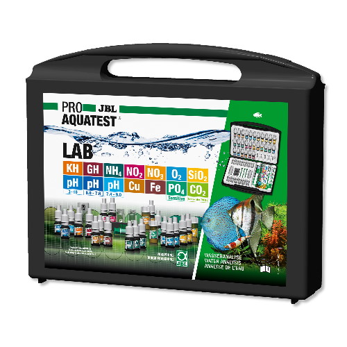 - Package contents: 1 test case, incl. 13 tests, 12 glass vials, 2 syringes, 3 measuring spoons, thermometer, comparator block, 2 plastic cuvettes, colour charts, CO2 table, pen, report sheets, operating instructions